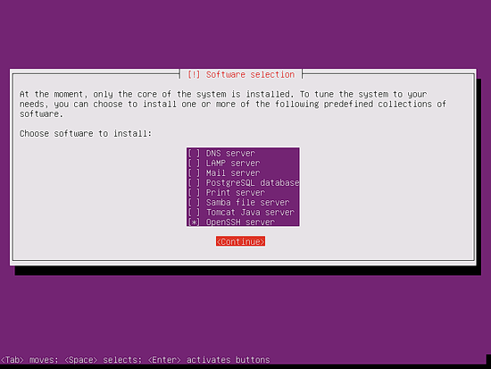 -Select the softwares you want to install on your server. Press the space bar to select software, when finished press enter to continue. You can continue without installing any software and install it later if you wish: