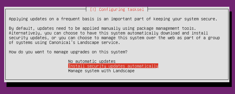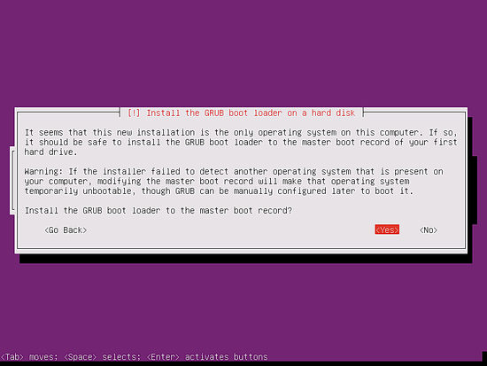 -Ubuntu Server will now be installed. When complete, one final question asks for permission to install the GRUB boot loader. You should answer ‘Yes’: