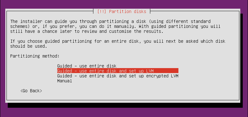 -Select partition disk option.The simplest one is the, ‘Guided – use entire disk and set up LVM’.But you can do it manually, if you are installing alongside another operating system: